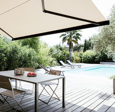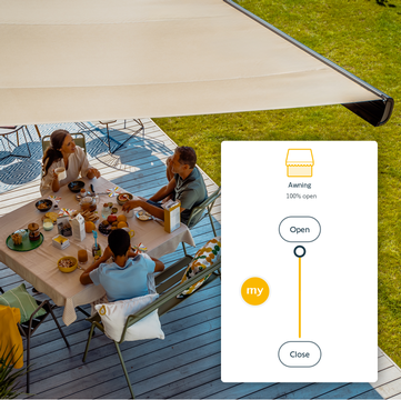 When the sun's out and it's hot, your awning opens automatically to keep your home cool. If there's a storm, check remotely if the awning is closed and roll it up if you need to. On summer weekends, set up a tip-top terrace by creating a scene using your connected pergola or awning, lights and your favorite music.
