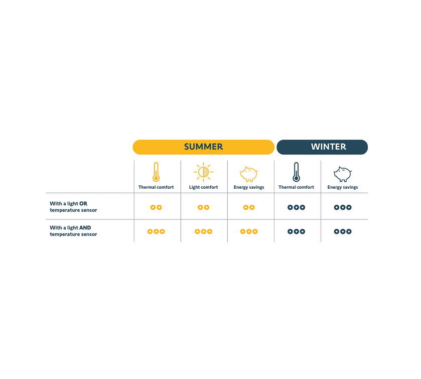 Outdoor sunlight and/or indoor temperature sensors can be added. Thanks to them, your window coverings can be automated in summer and winter according to the temperature inside and the level of sunlight.